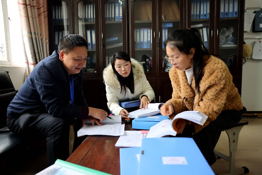 图为砚山县纪检监察干部在砚山县第三小学检查校服订购情况