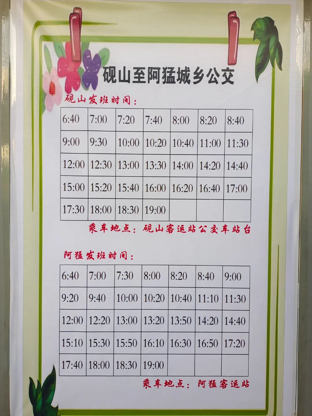 砚山至阿猛城乡公交线路采用纯电动公交车,配备空调系统、软包座椅及三点式安全带,兼顾环保与舒适性。沿途设砚山客运站、阿猛客运站两大核心站点,并支持“招手即停”,灵活服务沿线村寨。运营时间覆盖早6:40至晚19:00,发车间隔约20分钟一班,可充分满足群众通勤、办事、探亲等多样化出行需求 。