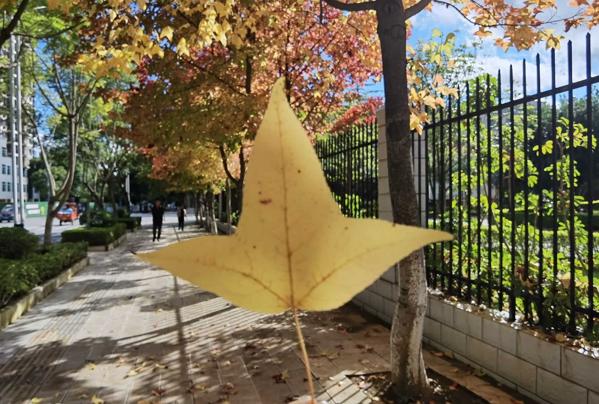 这几天,走在砚山的新城大道,细心的市民会发现,道路两旁有着十多年树龄的银杏树已披上了“黄金甲”,在阳光照射下,树上一片片黄色的银杏叶,犹如一串串金色风铃。除了金黄的银杏,砚山还有不少地方的枫叶也红了。枫叶与银杏交织而成的彩叶林美翻了,像是被调色板打翻了一样,让人沉醉!
