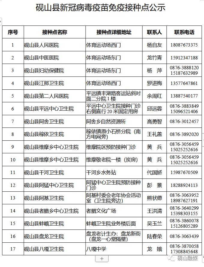 (二)接种地点:全县共设置17个集中接种点,其中:县城4个,平远镇、阿猛镇、维摩乡分别设置2个,其余乡(镇)各设置1个(具体接种点名单附后)。另外,各乡(镇)可视接种情况设置若干流动接种台,满足广大群众接种需求。