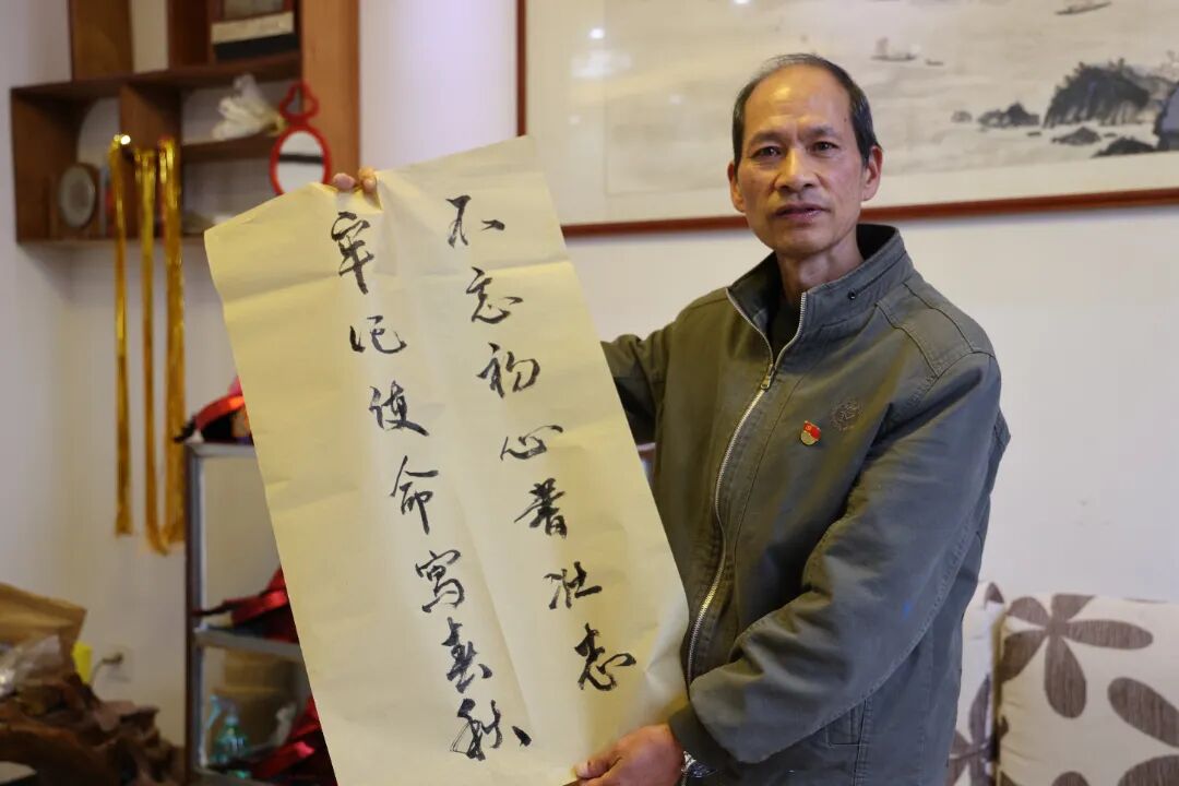 日子越过越红火,唐廷超并未停下追求美好生活的脚步。他自幼喜爱书法,脱贫后有了更多闲暇时间,便重新拾起这份爱好。每日坚持挥毫泼墨,潜心研习,久而久之,书法技艺日渐精湛,笔下字迹刚劲有力、韵味十足。