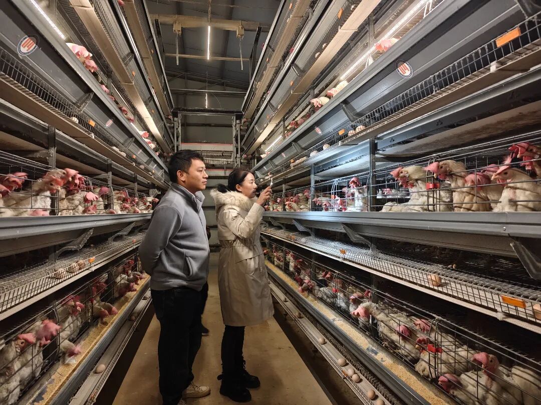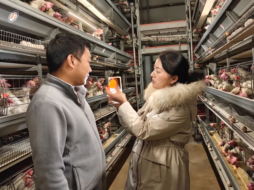 陆云通过仔细查看通风设备运行情况,仔细检查鸡蛋品质,详细询问蛋鸡存栏、饲料配比、疫病防控等关键环节,并不时与企业技术负责人、一线饲养员交流探讨。针对养殖人员提出的“蛋鸡产蛋率波动”“设备维护效率低”等棘手问题,她结合自身多年经验逐一分析,现场演示操作技巧,提出了6条可落地的改进建议,帮助养殖户提升养殖的效率。
