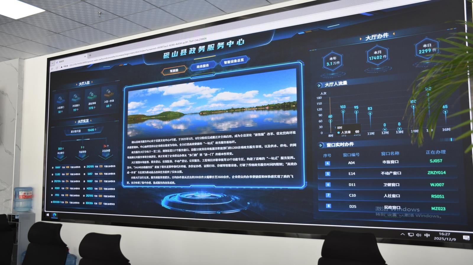 在正对入口的电子大屏上,大厅实况、人流量、实时办件等信息一目了然。大屏数据显示,截至16:25分,12月9日当天办件已达2299件,尚有24人正在办理、9人在等待。“区域办理等待人数低于10人时显示为绿色,10至20人时为橙色,20人以上变为红色”,县政务服务管理局局长彭海军介绍,这个大屏就像中心的“大数据驾驶舱”,直观呈现各窗口排队时长、高频事项等多项重要指标,等待人数较多时能动态启用“潮汐窗口”支援、缩短群众等待时长。